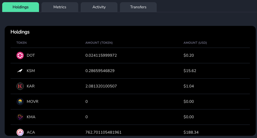 Moving into milestone 2, the Alphabit team set out to highlight the top crowdloan investors in order to give the everyday investor a sense of who's investing in each crowdloand and the spread of contributions. Through the Alphabit UI you can see the descending ranked order of the top contributors to any crowdloan on each chain. A user can then click into the parachain and see a list of wallets (also descending by contribution amount) and go one step further by selecting a particular wallet to see total holdings and other metadata about the wallet.