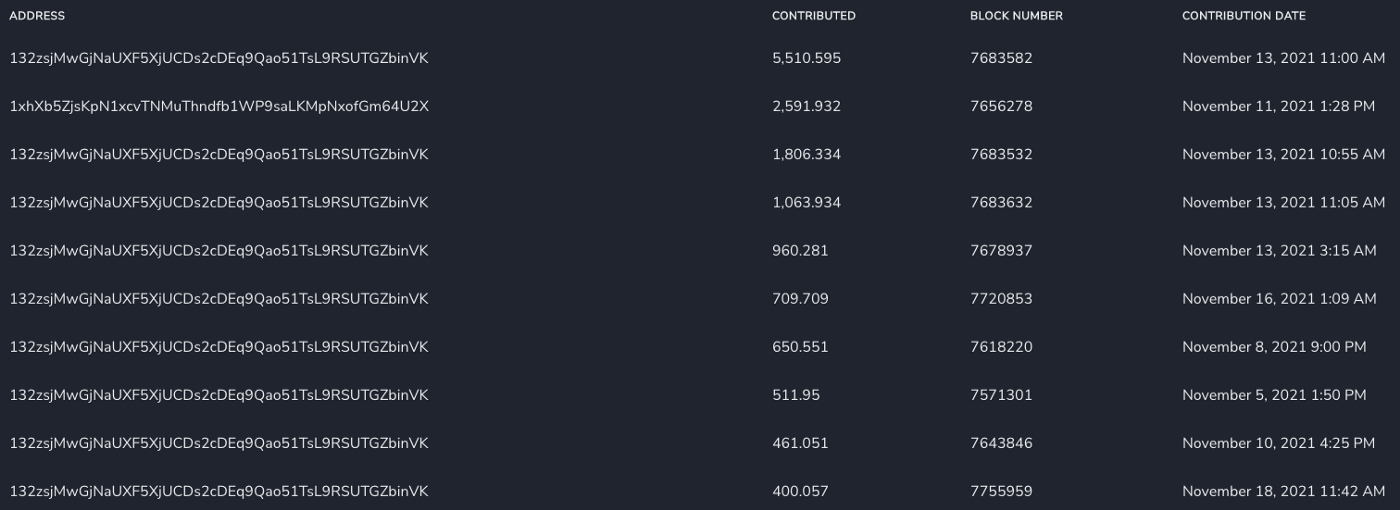 A snippet from the Alphabit.ai UI showing the breakdown of contributions to the Acala crowdloan which won them a slot on the Polkadot relay chain at the end of 2021.
