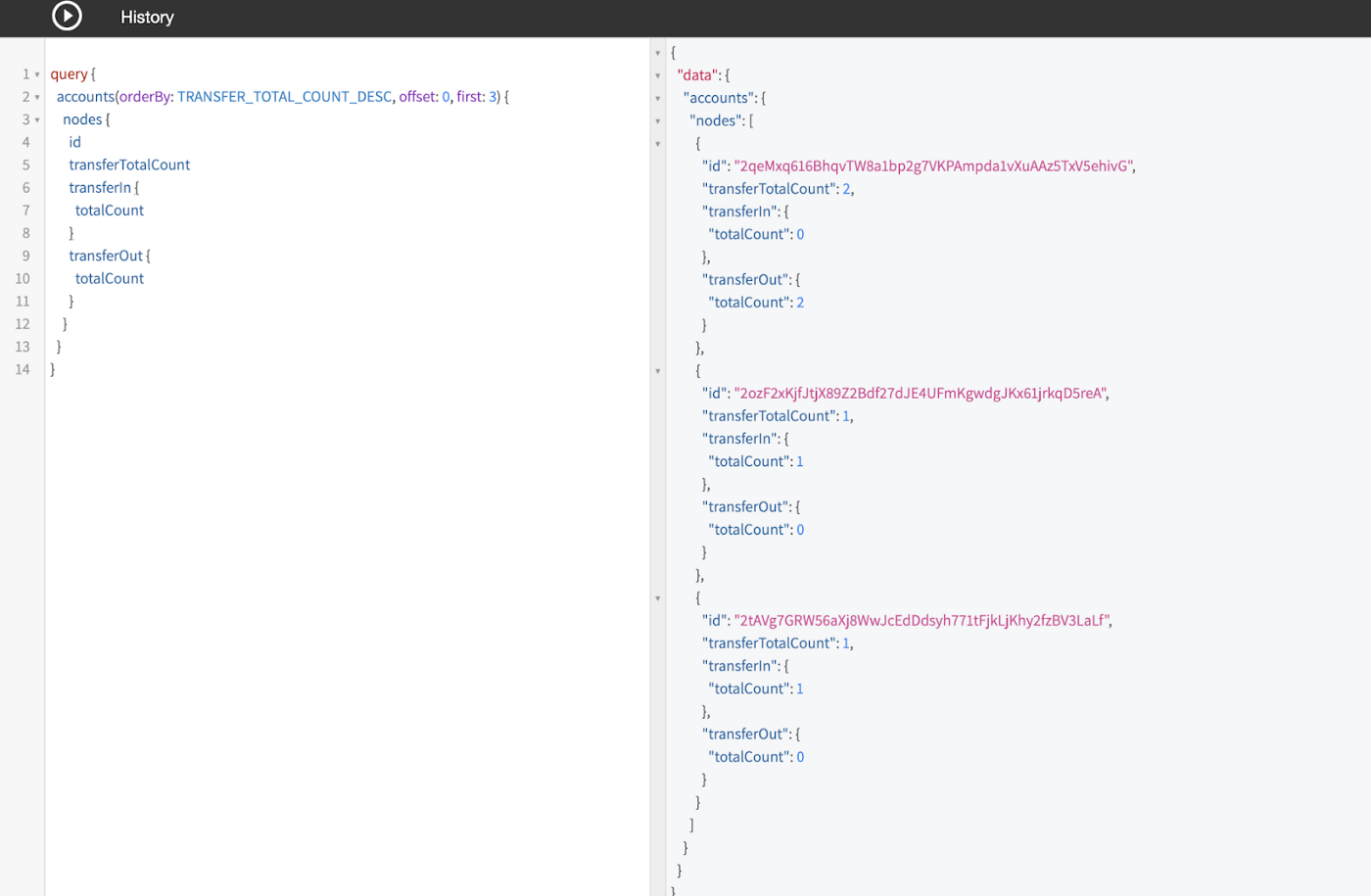 Thanks to SubQuery, we can easily query the transfer times of each account on the chain. For example, we can get the three account with the most sent and receive transactions through the query below: