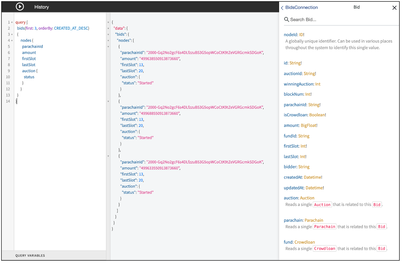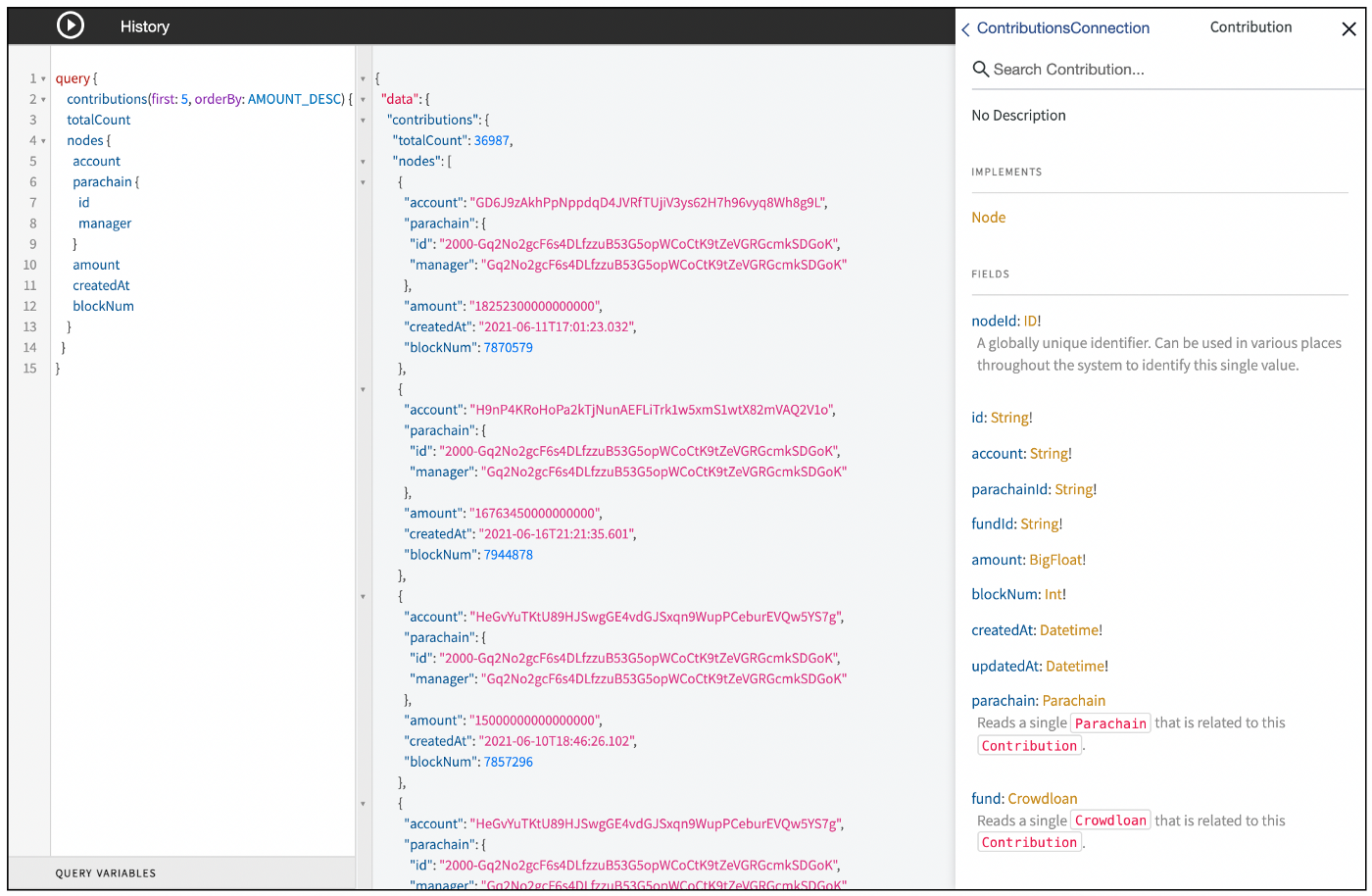 Thanks to SubQuery, we can easily query the total contributions to each parachain, and see how this data changes over time. For example, we can get the 5 largest single contributions to crowdloans through the query below