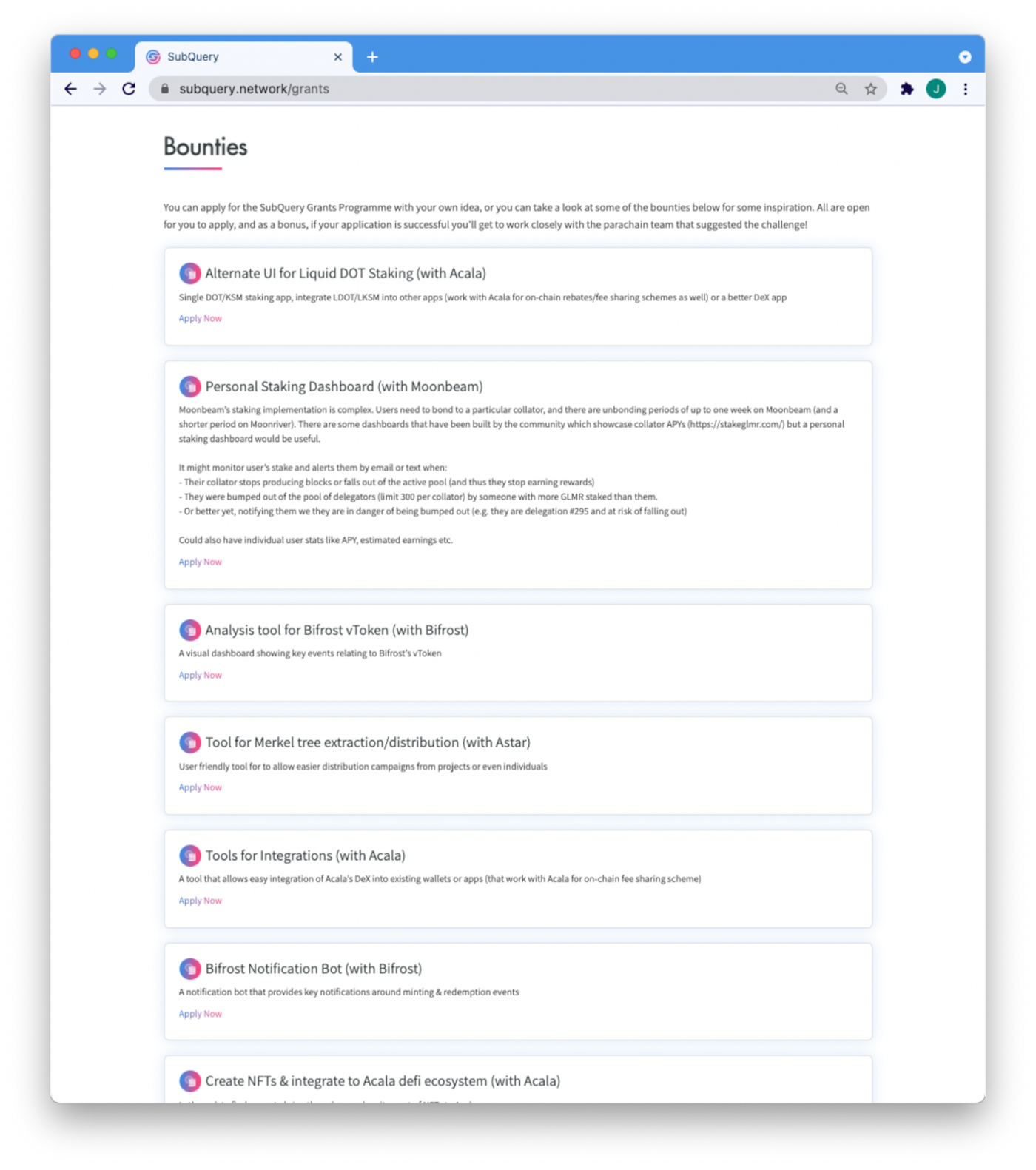 While developers can still apply for the SubQuery Grants Programme with their own ideas, SubQuery has released initial bounties in partnership with Moonbeam, Acala, Astar and Bifrost as projects for inspiration. All are open to apply now, and as a bonus, if your application is successful you’ll get to work closely with the parachain team that suggested the challenge!