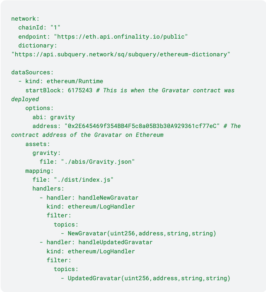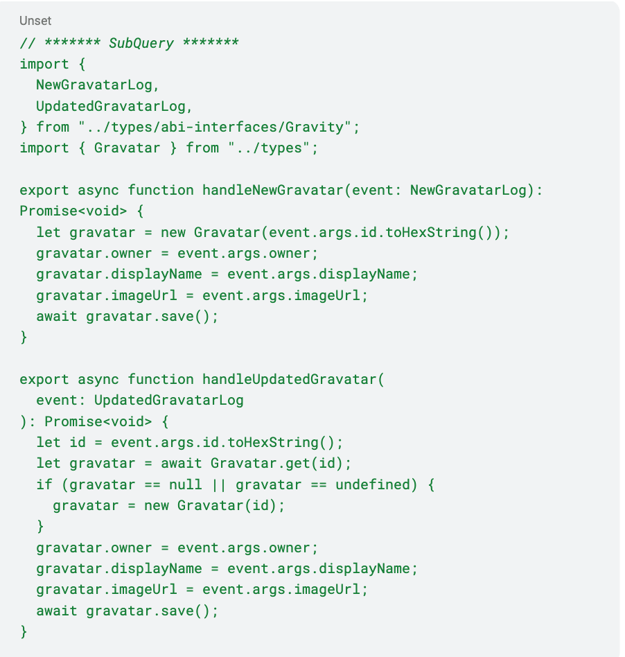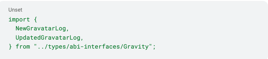 For ABI's registered in the project.yaml, similar type safe entities will be generated using npx typechain --target=ethers-v5 command, allowing you to bind these contracts to specific addresses in the mappings and call read-only contract methods against the block being processed. It will also generate a class for every contract event to provide easy access to event parameters, as well as the block and transaction the event originated from. All of these types are written to src/types directory. In the example Gravatar SubQuery project, you would import these types like so.