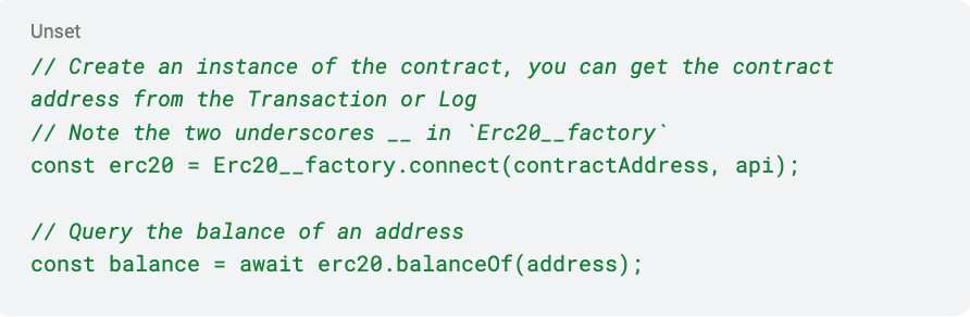 We globally provide an api object that implements an Ethers.js Provider. This will allow querying contract state at the current block height being indexed. The easiest way to use the api is with Typechain, with this you can generate typescript interfaces that are compatible with this api that make it much easier to query your contracts.You can then query contract state at the right block height. For example to query the token balance of a user at the current indexed block height (please note the two underscores in Erc20__factory):