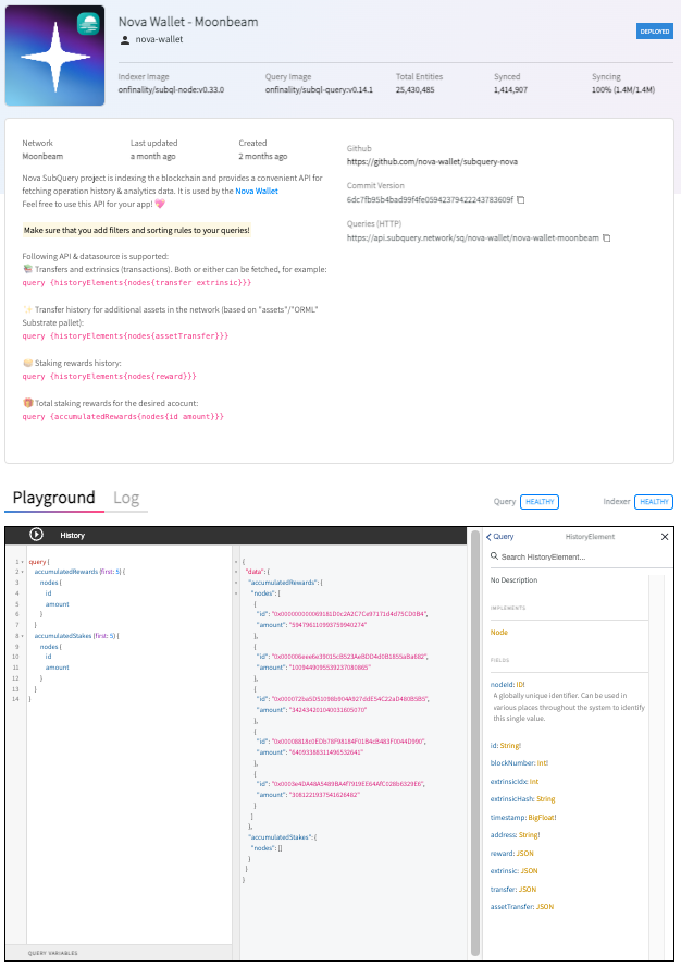 Nova Wallet further enhanced their growing list of SubQuery Projects (now 54!) by adding a unified format of the project descriptions in the SubQuery Explorer, which outlines exactly which features each project indexes. This means the community can leverage the open indexer Nova has built for every parachain with the same GraphQL interface.