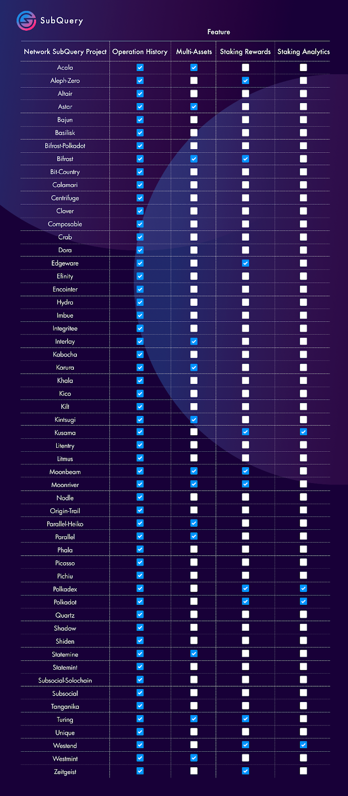 You can see the features available on each SubQuery project in the graphic below or through Nova Wallet's SubQuery GitHub table here.