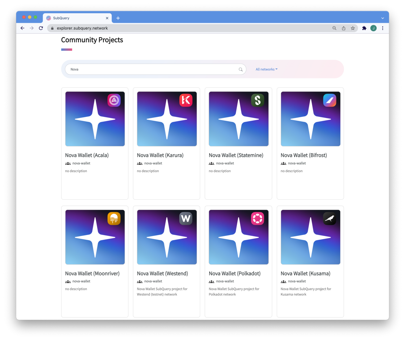Nova Wallet currently run multiple projects in the SubQuery Explorer available for the public to use and adapt. These projects have been implemented in the Nova Wallet and are being used by thousands of users around the world today. You can search for Nova to see a list of ready-made and indexed projects across most networks that will allow you to get started faster when building your own app.