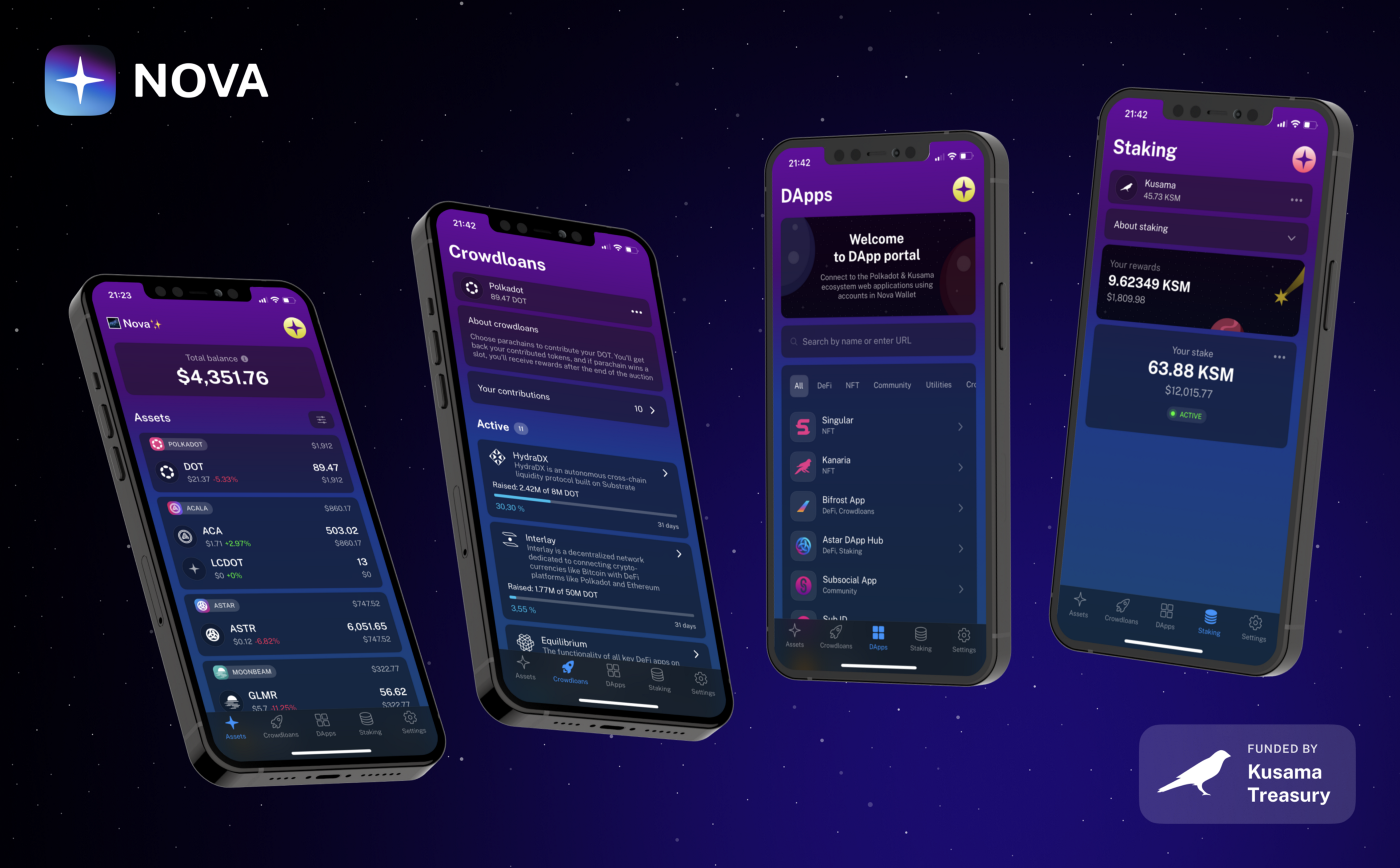 Nova Wallet is a next gen application for Polkadot & Kusama ecosystem, transparent & community-oriented, focused on convenient UX/UI, fast performance & security. Nova Wallet supports management for more than 50 assets in the Polkadot & Kusama ecosystem, provides a convenient way to participate in Crowdloans, supports decentralized Staking, and allows users to discover ecosystem DApps from the mobile interface. Nova Wallet is funded by Kusama Treasury and is available for iOS and Android devices from the Nova website.