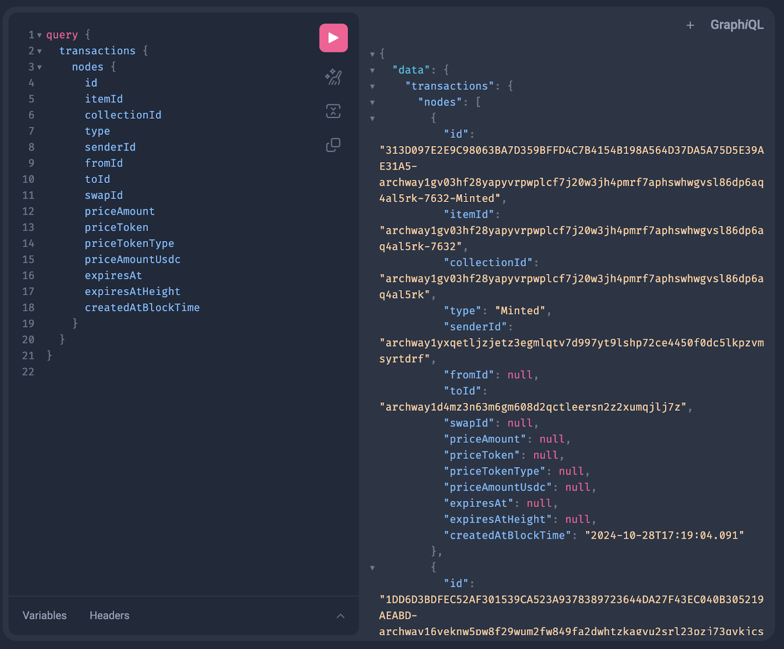To demonstrate the effectiveness of SubQuery’s integration, the following screenshots from the indexer playground showcase some relevant queries.
