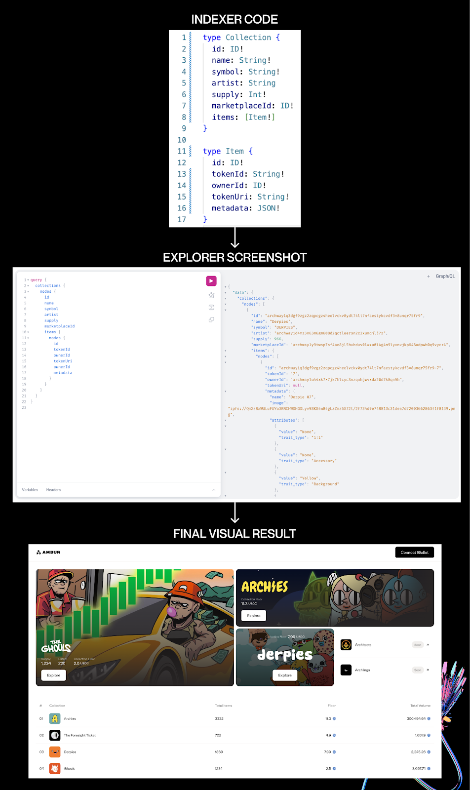 These screenshots illustrate how SubQuery's GraphQL API empowers Ambur Marketplace to efficiently present rich and dynamic data to its users.