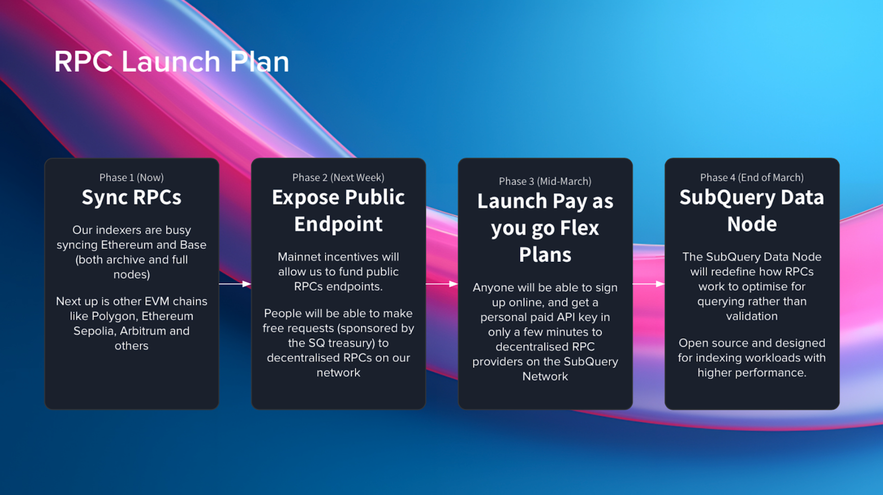 Public RPCs are the first step of our roadmap for full RPC support, as we detailed in March’s community call. In the coming weeks, we’ll continue to add further support with more networks, pay-as-you-go flex plan subscription pricing, and finally, the long awaited SubQuery Data Node.