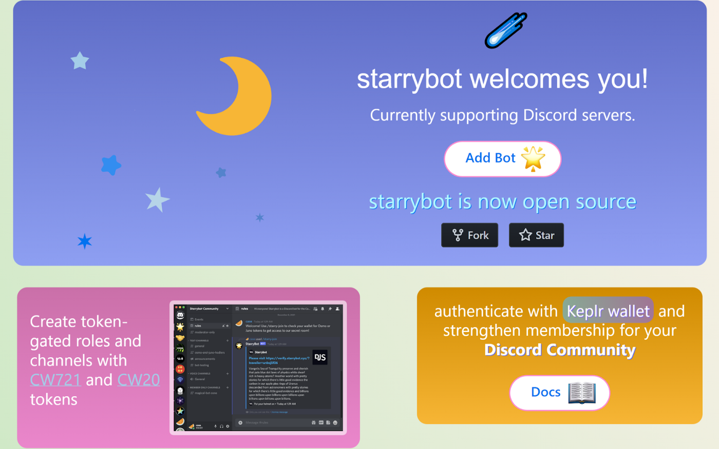 Starrybot is a discord bot which enables the guild admin to create token-gated roles and channels with CW721, CW20 and native tokens.