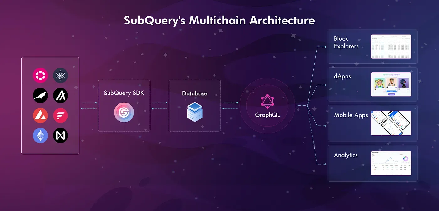 SubQuery is a blockchain developer toolkit facilitating the construction of Web3 applications of the future. A SubQuery project is a complete API to organise and query data from Layer-1 chains. Currently servicing NEAR, Polkadot, Avalanche, Algorand, Cosmos and Flare projects, this data-as-a-service allows developers to focus on their core use case and front-end without wasting time building a custom backend for data processing activities. In the future, the SubQuery Network intends to replicate this scalable and reliable solution in a completely decentralised manner.