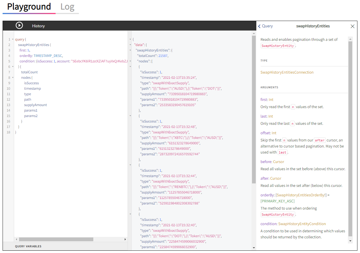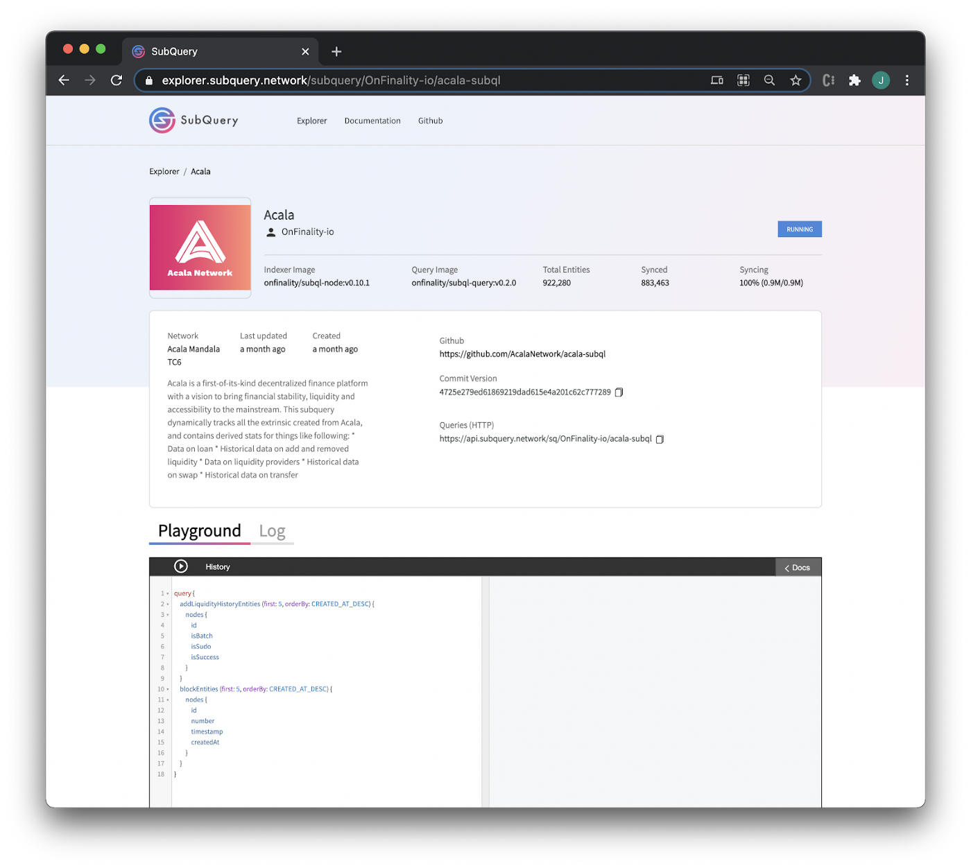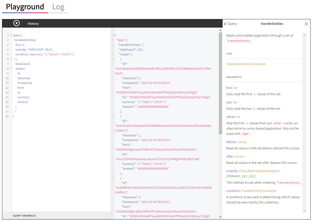You can play around with the Acala SubQuery Graph using the Explorer without implementing anything in code. Additionally, we’ve documented the types that you can specify in each GraphQL request when analysing Acala’s data.