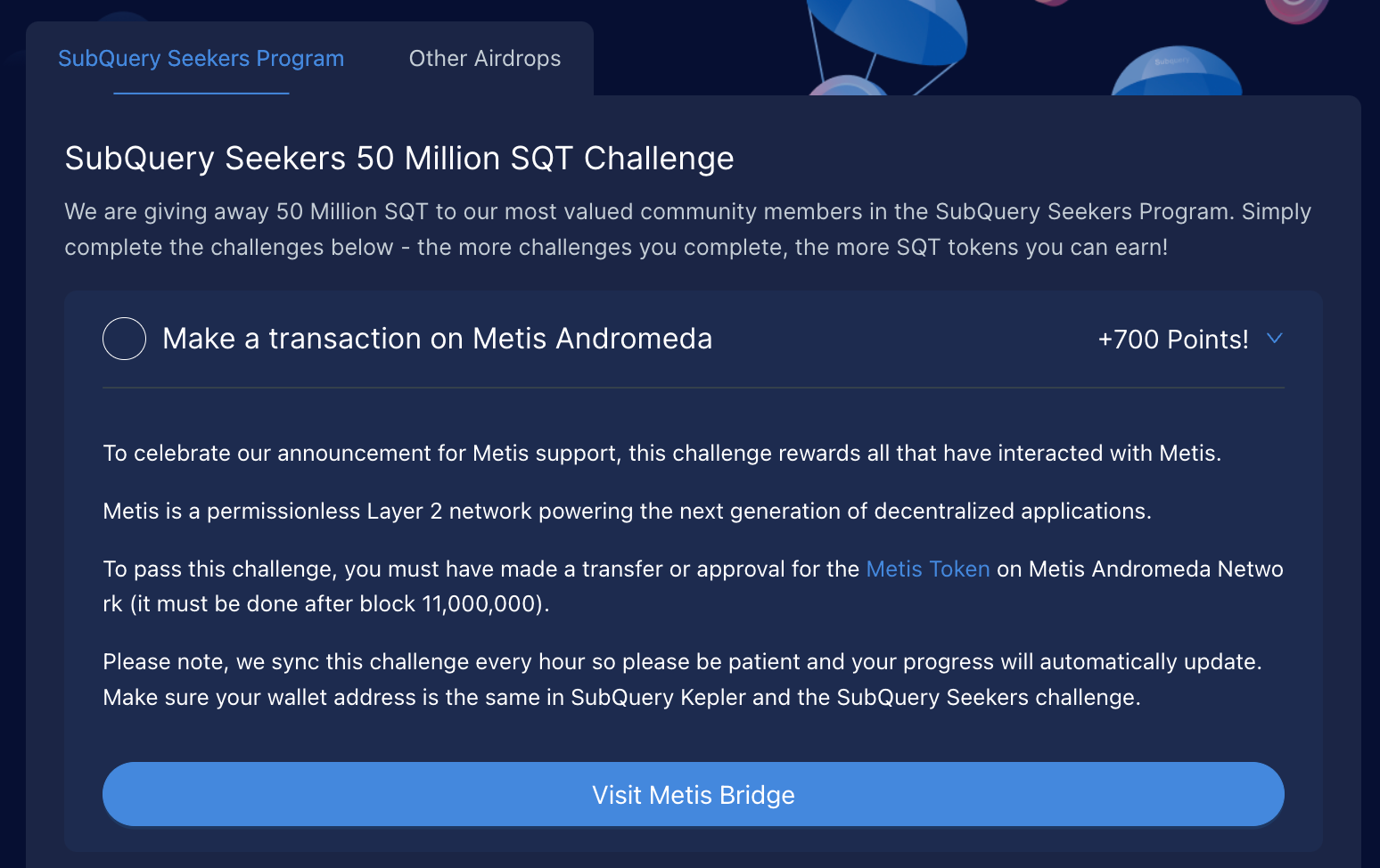 Please note that we sync this challenge every hour so please be patient and your progress will automatically update. Make sure your wallet address is the same in SubQuery Kepler and the SubQuery Seekers challenge.