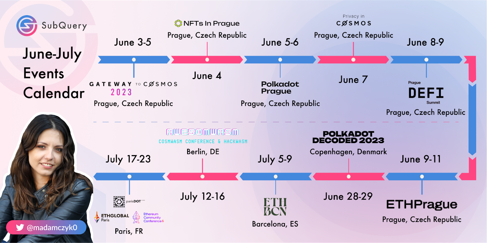 While this is a monthly recap for May, we wanted to include a quick note on the conferences that are happening in June. SubQuery has embarked on an exciting journey across Europe this summer! Led by our COO James Bayly and accompanied by our Technology Evangelist Marta Adamczyk, SubQuery is making waves at various crypto conferences throughout the continent.