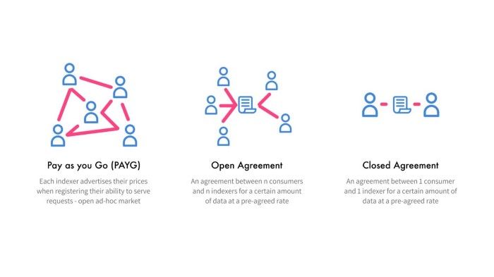 he combination of the above three payment options for indexers provide several advanced subscription based options for Consumers and Indexers. Some parties may benefit from the certainty of rewards provided by Closed Agreements and the predictability of recurring costs. Equally, others may instead prefer to hunt out the most affordable data by going for high volume recurring agreements or low spot prices on the Pay-as-you-Go market.